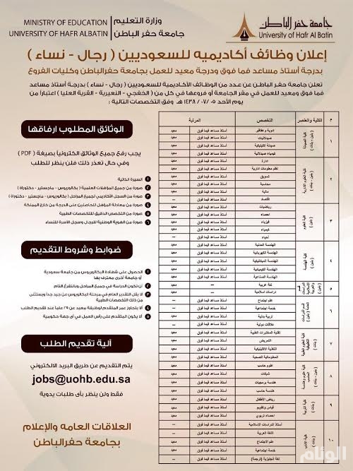 بوابة القبول جامعة حفر الباطن. أعلنت جامعة حفر الباطن عن استقبال طلبات التقديم على وظائف معيد للجنسين في عدد من التخصصات وذلك ابتداء من يوم غد الخميس حتى الثامن عشر من شهر رمضان المبارك. 4 ألا يكون للطالب سجلا حاليا أو سابقا في جامعة حفر الباطن.